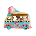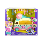 É hora de doces em movimento com o Playset Polly Pocket Tiny Treats Ice Cream Truck com mais de 18 peças (inclui bonecas Polly e Shani de 3 polegadas). Polly e Shani estão prontas para um dia divertido de guloseimas de sorvete com este caminhão de sorvete que rola e tem uma casquinha de sorvete adorável no topo! A porta do caminhão de sorvete se abre para brincar de contar histórias com uma figura de cachorro, peças de comida e roupas e acessórios.