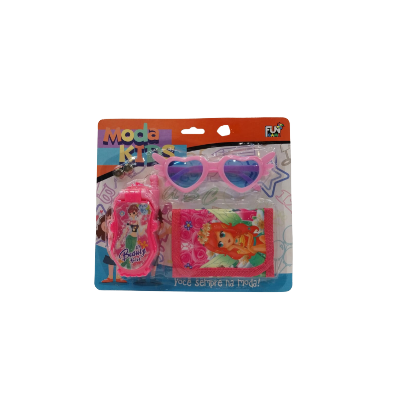 Com um celular de brinquedo, óculos fashion e uma carteira rosa super fofa, o kit oferece tudo o que os pequenos precisam para se sentirem verdadeiras estrelas do dia a dia. Ideal para brincadeiras de faz de conta, o conjunto estimula a criatividade e desenvolve habilidades sociais, à medida que as crianças simulam chamadas, organizam seus acessórios e se divertem com amigos.