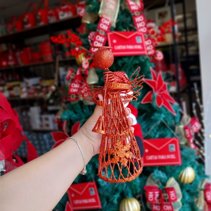 - Design: Anjo decorativo com detalhes em glitter vermelho, ideal para complementar sua decoração natalina